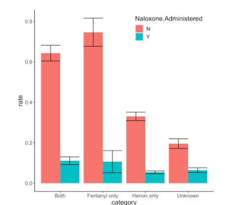 Rates of death are higher when fentanyl is known to be present, with or without heroin also known to be present. The naloxone effect is again striking. (This is for all patients).